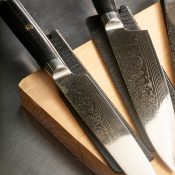 Couteaux de cuisine haut de gamme, en acier feuilleté forgé (acier damas) : une couche d'acier centrale en 10Cr15Mov (acier dur pour le fil de la lame), entourée de chaque côté par 67 couches d'acier pliées en forge (feuilleté). La lame est très tranchante tout en étant très résistante (dureté 60+-2 HRC). Manche en G10 fibre de verre imprégné d'époxy - solide, durable et haute résistance à l'humidité.